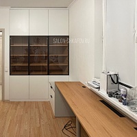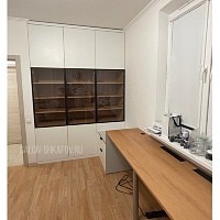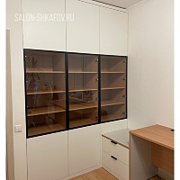 Наша работа - рабочая зона: шкаф со стеклянными вставками по центру, стол и дополнительная тумба.