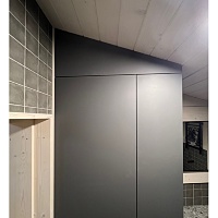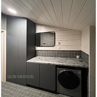 Пространство со скошенным потолком требовало нестандартного решения, поэтому шкаф был спроектирован точно под геометрию помещения и с нишей под стиральную машину.
